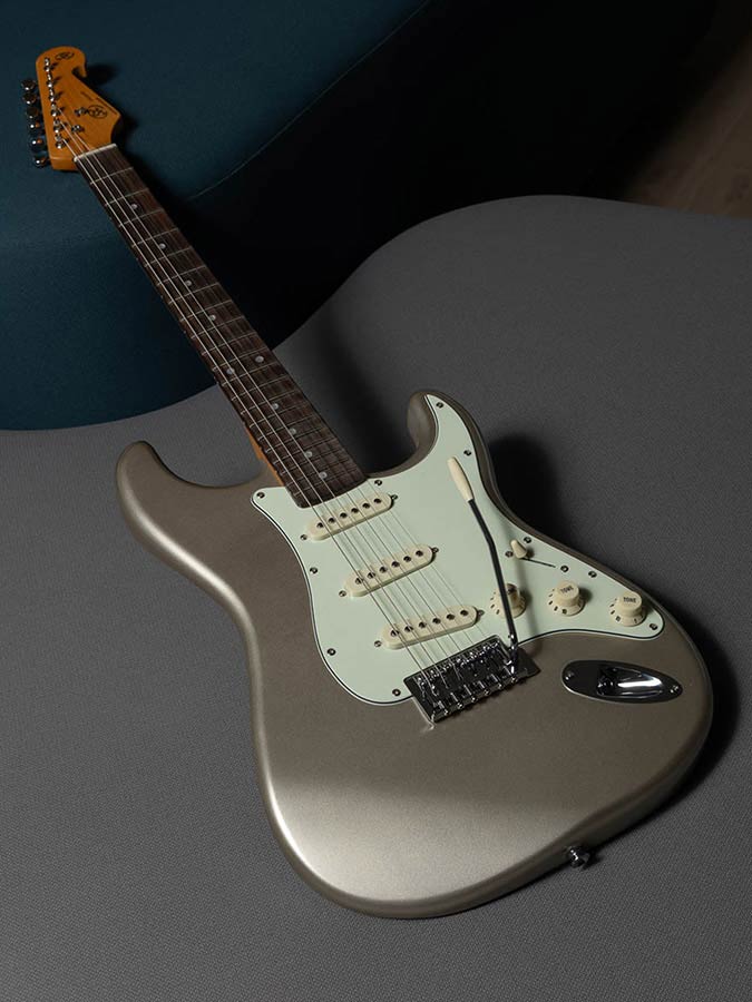 Inspired by the new Pontiac cars from 1959, Shoreline Gold was introduced as a Fender custom colour option until late 1965. It was then replaced with Firemist Gold.