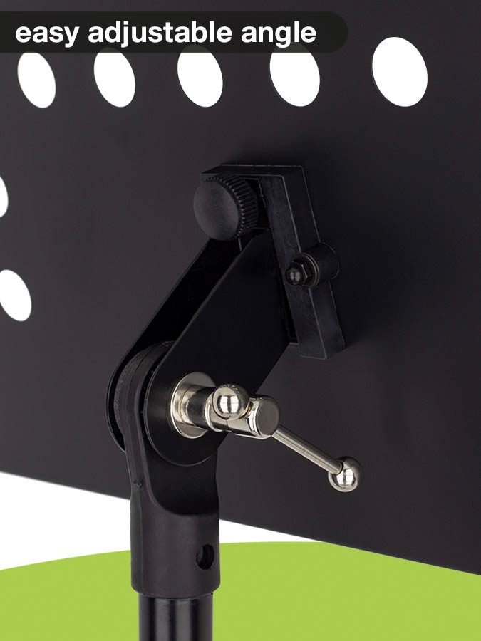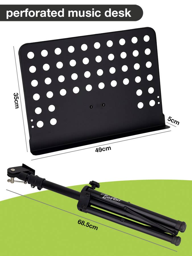 The perforated music desk's angle is adjustable and when needed it can be removed completely for transport or putting away purposes, although the OMS-302 can be transported perfectly by just folding it.