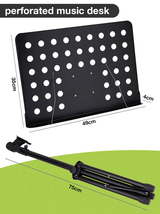 The perforatedmusic desk can be completely removed from the stand for transport purposes, although the complete stand, when folded, is quite compact already.