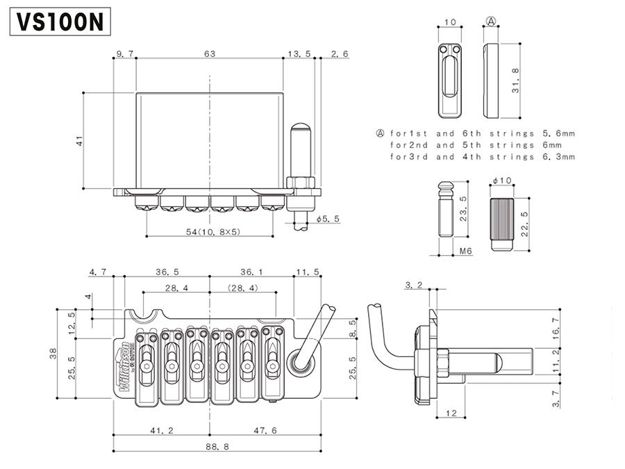 The tremolo arm in the VS100N is made of stainless steel without plating. The thickness of the plating is very hard to control and can cause a less precise fit. The arm is threaded inside and will match with the thread underneath the baseplate. With this it is possible to set the height of the tremolo arm. A unique and very welcome feature!