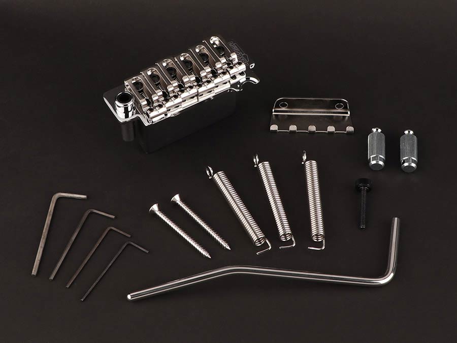 A unique, high quality tremolo with saddles that lock to a hardened steel baseplate for better tuning stability, string energy transfer and sustain. Each saddle is height-adjustable. Threaded studs and bushings, springs, spring claw, allen wrenches and adjustable-tension arm are included.