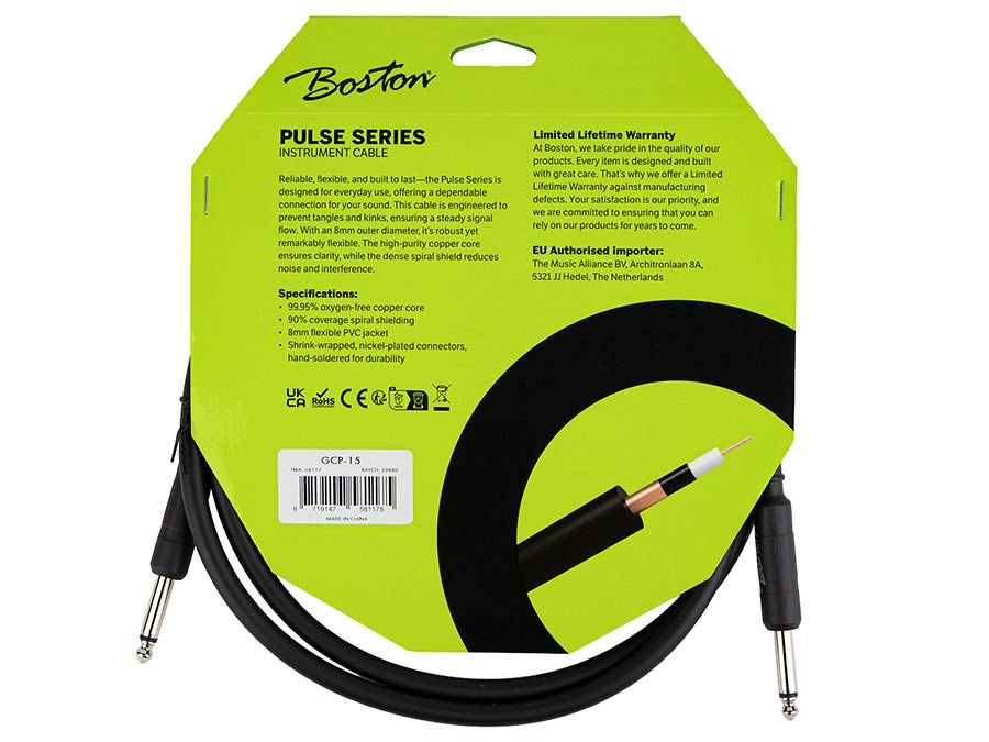 The Boston Pulse Series Instrument Cable is built for musicians who value reliability, flexibility, and consistent performance. Designed for everyday use, it combines a high-purity oxygen-free copper core with a dense spiral shield to deliver a clear signal with reduced noise and interference. Its remarkably flexible construction helps prevent tangles and kinks, while the robust 8 mm PVC jacket offers durability without stiffness. Finished with hand-soldered, nickel-plated connectors, the Boston Pulse Series Instrument Cable provides a solid, trustworthy connection for practice rooms, stages, and studios alike.