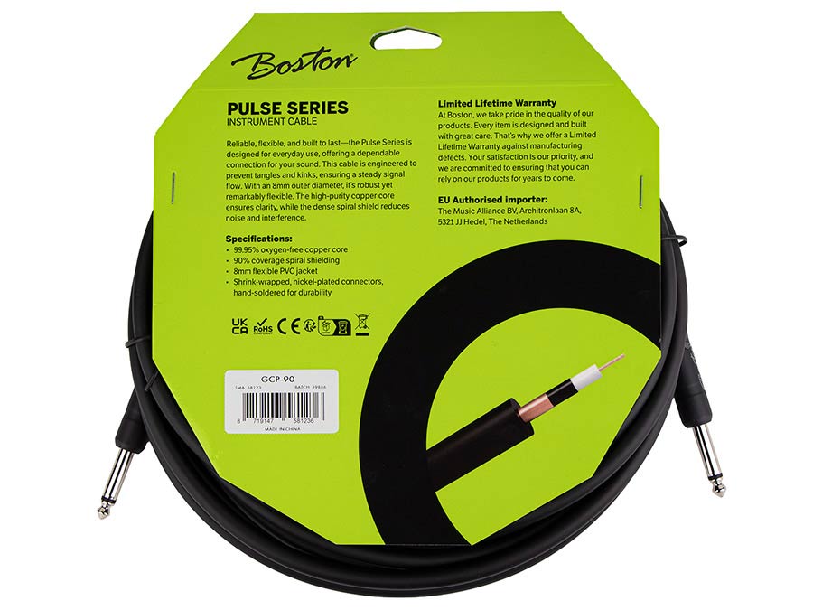 The Boston Pulse Series Instrument Cable is built for musicians who value reliability, flexibility, and consistent performance. Designed for everyday use, it combines a high-purity oxygen-free copper core with a dense spiral shield to deliver a clear signal with reduced noise and interference. Its remarkably flexible construction helps prevent tangles and kinks, while the robust 8 mm PVC jacket offers durability without stiffness. Finished with hand-soldered, nickel-plated connectors, the Boston Pulse Series Instrument Cable provides a solid, trustworthy connection for practice rooms, stages, and studios alike.