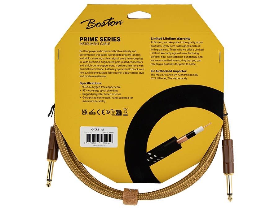 The Boston Prime Series Instrument Cable is designed for players who want dependable performance with a distinctive look. Built around a high-purity oxygen-free copper core, this cable delivers a clear, rich signal with minimal interference, whether on stage or in the studio. The flexible spiral shielding keeps noise under control and is designed to prevent tangles and kinks, while the woven tweed jacket adds durability and a classic vibe. Finished with gold-plated, hand-soldered connectors, the Boston Prime Series Instrument Cable is made to perform reliably, night after night.