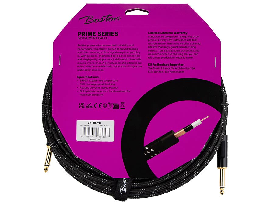 The Boston Prime Series Instrument Cable is designed for players who want dependable performance with a distinctive look. Built around a high-purity oxygen-free copper core, this cable delivers a clear, rich signal with minimal interference, whether on stage or in the studio. The flexible spiral shielding keeps noise under control and is designed to prevent tangles and kinks, while the woven tweed jacket adds durability and a classic vibe. Finished with gold-plated, hand-soldered connectors, the Boston Prime Series Instrument Cable is made to perform reliably, night after night.